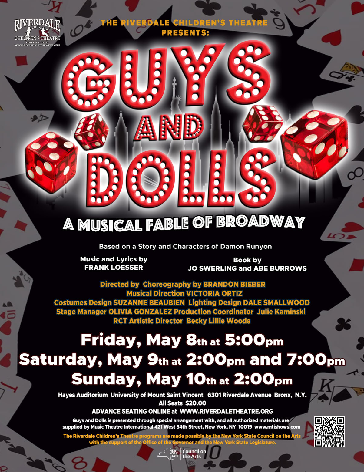 Set in Damon Runyon's mythical New York City, Guys and Dolls is an oddball romantic comedy. Gambler, Nathan Detroit, tries to find the cash to set up the biggest craps game in town while the authorities breathe down his neck; meanwhile, his girlfriend and nightclub performer, Adelaide, laments that they've been engaged for fourteen years. Nathan turns to fellow gambler, Sky Masterson, for the dough, and Sky ends up chasing the straight-laced missionary, Sarah Brown, as a result. Guys and Dolls takes us from the heart of Times Square to the cafes of Havana, Cuba, and even into the sewers of New York City, but eventually everyone ends up right where they belong. Considered by many to be the perfect musical comedy, Guys and Dolls ran for 1,200 performances when it opened on Broadway in 1950. It received nearly unanimous positive reviews from critics and won a bevy of awards, including Tony Awards, Drama Desks and Oliviers.